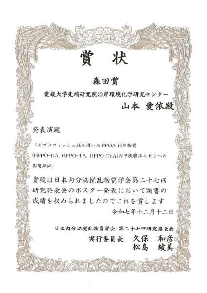 令和7年12月11日(木)および12日(金)に、つくば市・文部科学省研究交流センターにて開催された「第27回日本内分泌撹乱物質学会研究発表会」において、沿岸環境科学研究センター(CMES)化学汚染・毒性解析部門所属、大学院理工学研究科博士前期課程1年の山本愛依さんがポスター発表し、森田賞を受賞しました。受賞対象となった発表題目は「ゼブラフィッシュ胚を用いたPFOA代替物質(HFPO-DA、HFPO-TA、HFPO-TeA)の甲状腺ホルモンへの影響評価」であり、本研究は、沿岸環境科学研究センターの野見山 桂 准教授、田上 瑠美 准教授、国末 達也 教授の指導のもと実施されたものです。